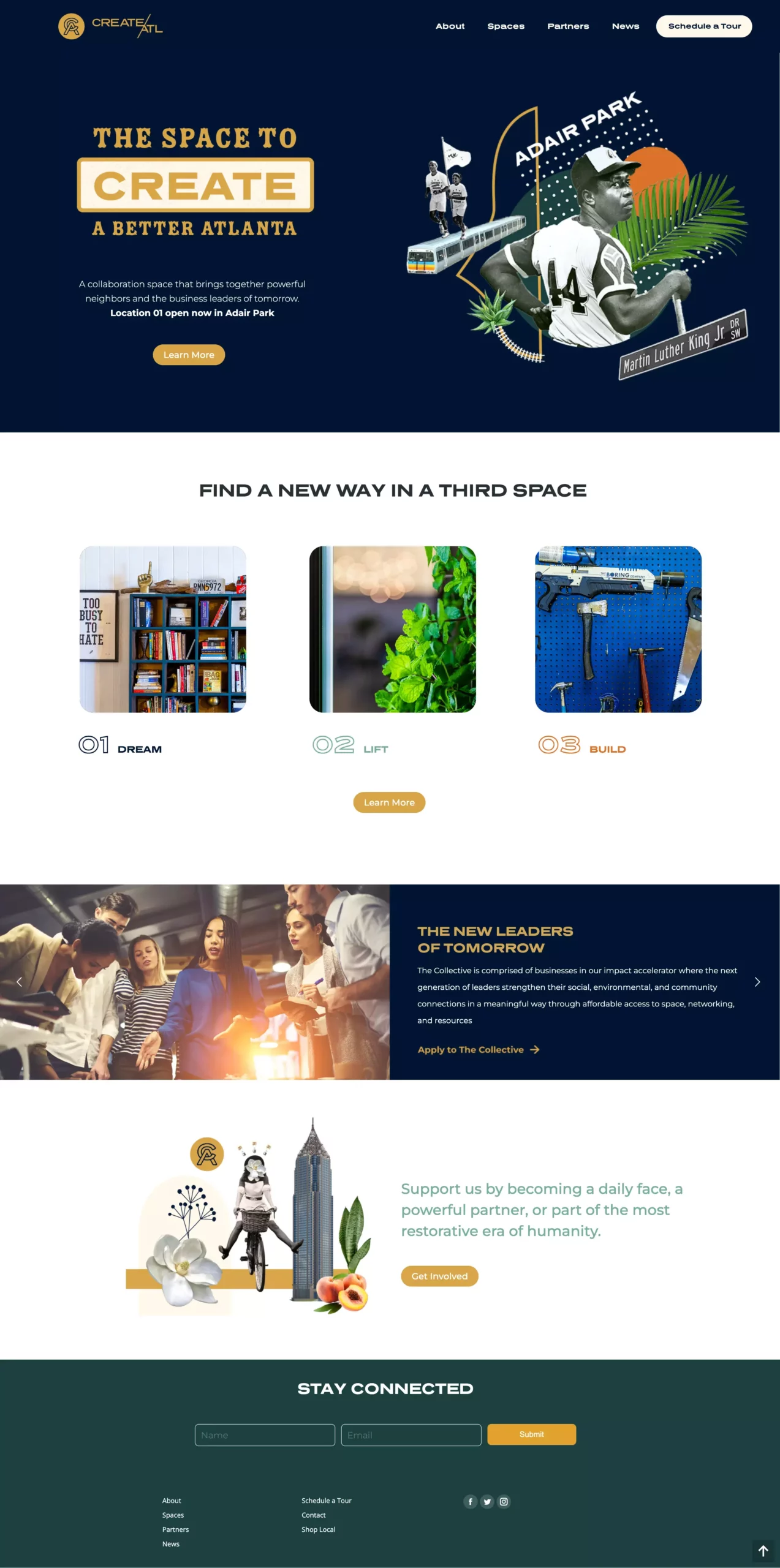 To help them achieve their mission, we created a website that would allow future patrons to learn about their ethos and mission, explore their workspace options, and dive deeper into the budding community CreateATL is building. Warm earth tones and iconic Atlanta figures and locations collage together to create this brand’s visual styling as they make their mark city-wide.